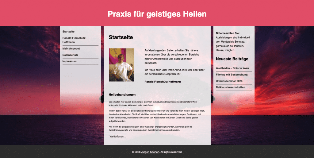 ← Back Portfolio Category: 1. Websites Geistiges Heilen WordPress website with custom theme. Project Details: Client: Ronald Florschütz-Hoffmann URL: https://geistigesheilen-kl.de/ Features:Wordpress, CSS, PHP Custom Theme + Child Theme